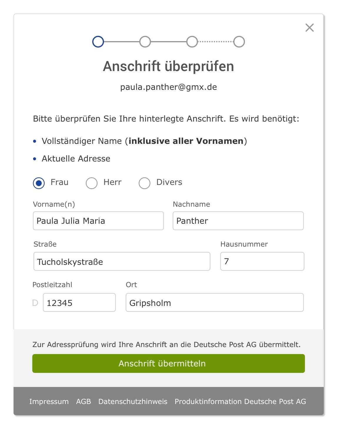 Nach Übermittlung der Daten an die Deutsche Post werden als Erstes die Adressdaten (Straße, Hausnummer, Postleitzahl und Ort) auf ihre Plausibilität, also die Existenz und Korrektheit der eingegebenen Adresse, geprüft. Hierbei werden die Schreibweisen auf den Standard der Deutschen Post normiert, um einen korrekten Abgleich zu ermöglichen. Sollten die Angaben nicht plausibel sein, so wird der Nutzer gebeten, seine Adressdaten zu korrigieren. Liegt eine plausible, normierte Adresse vor, so wird diese dem Nutzer zur Bestätigung noch einmal angezeigt.