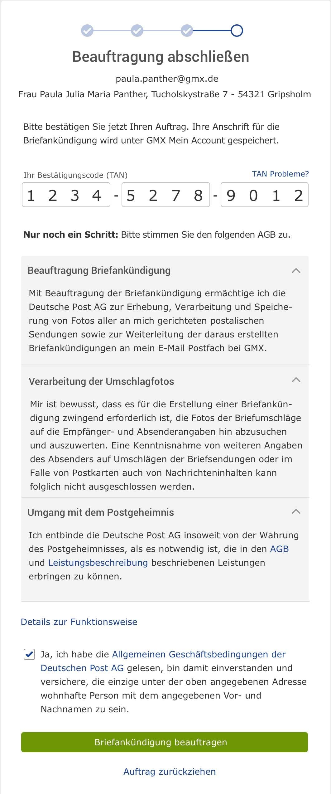 Mit der Eingabe des Bestätigungscodes erteilt der Nutzer der Deutschen Post den Auftrag zur Erbringung des Services Briefankündigung für ihn. Hierbei akzeptiert der Nutzer die Allgemeinen Geschäftsbedingungen (AGB) des Services Briefankündigung, versichert gegenüber der Deutschen Post noch einmal ausdrücklich, die einzige unter der angegebenen Adresse wohnhafte Person mit dem angegebenen Vor- und Nachnamen zu sein und erteilt der Deutschen Post die notwendigen Vollmachten zur Erbringung des Services.