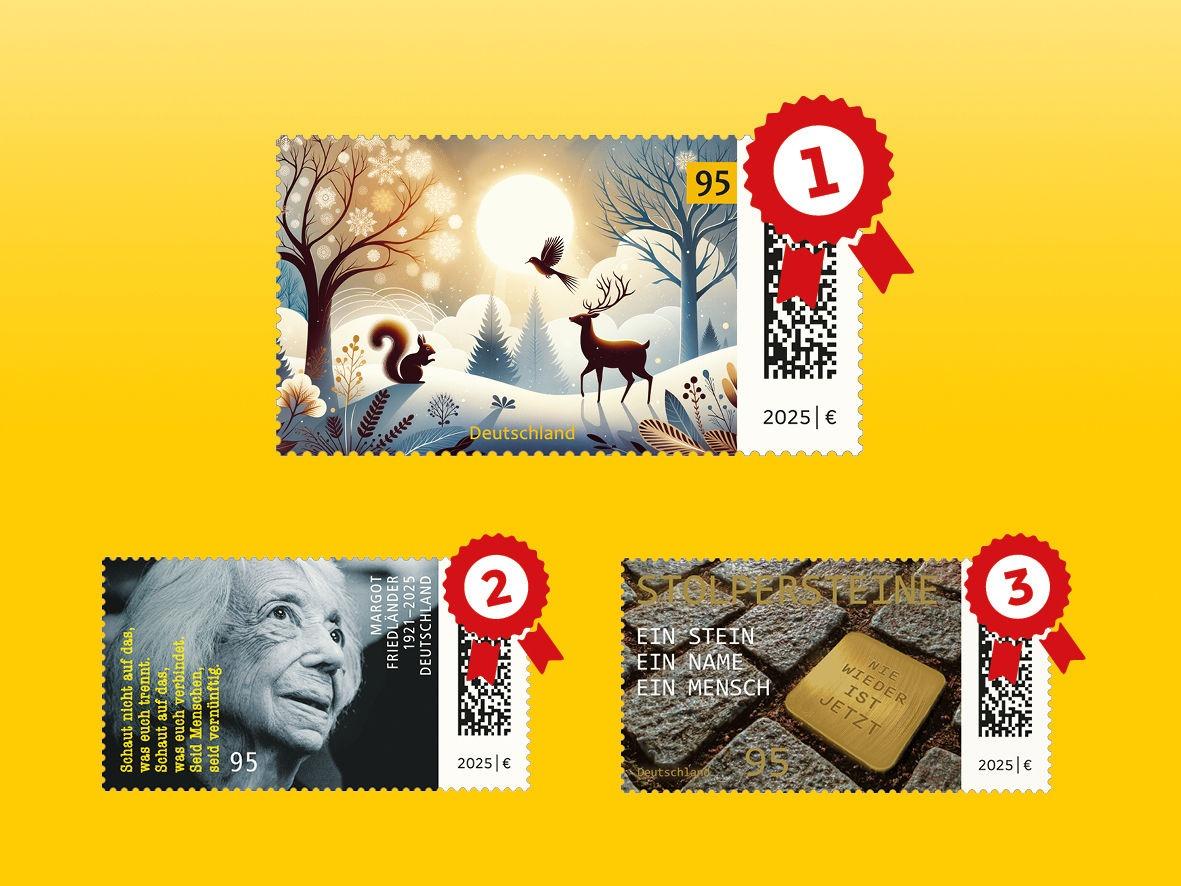 Deutschlands Briefmarkenfreunde haben abgestimmt: Die Briefmarke „Winterlandschaft“ ist die schönste Briefmarke des Jahres 2025. Sie zeigt eine schneebedeckte Landschaft mit stimmungsvollem Licht, Wald und Tieren. „Die ganze Szenerie strahlt Ruhe und Frieden aus. Danach sehnen sich offensichtlich gerade viele Menschen“, sagt Thomas Steinacker, Briefmarken-Designer der Deutschen Post, zu seinem Siegermotiv. Dieses hatte zuvor bereits eine Abstimmung unter den Post-Mitarbeitenden für das schönste Briefmarken-Wintermotiv gewonnen. Unerwartet landeten auf den Rängen 2 und 3 mit „Margot Friedländer“ und dem Motiv „Stolpersteine“ Briefmarken, die an die Verbrechen des Nationalsozialismus erinnern. Das zeigt, dass bei der Wahl der schönsten Marke nicht nur die Stimmung des Motivs, sondern auch die Thematik eine wichtige Rolle spielt. Auf den Plätzen vier bis sechs folgten Stadtmotive: die Hamburger Speicherstadt, die U-Bahn-Station „Bochum Rathaus Süd“ und die Semperoper in Dresden. Beliebt sind nach wie vor Tiermotive: Der Wolf und das Kaninchen landeten auf den Rängen sieben und zehn. Die Comic-Helden Tom & Jerry sowie Drache Kokosnuss belegten Platz acht und neun. Über 27.000 Teilnehmerinnen und Teilnehmer haben bei der Umfrage der Deutschen Post mitgemacht.