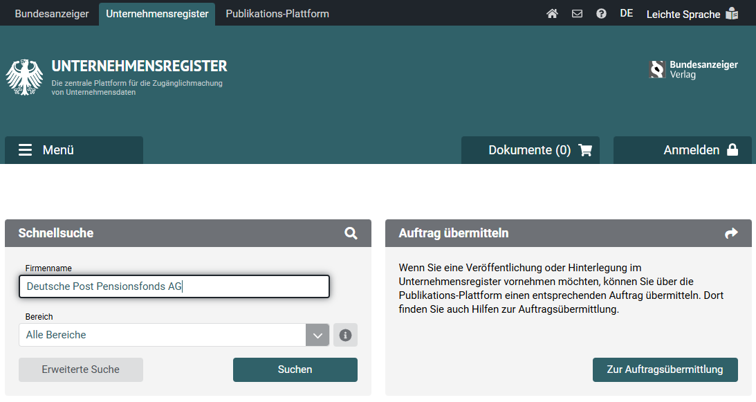 Der aktuelle Jahresabschluss der Deutsche Post Pensionsfonds AG kann auf der Internetseite des Unternehmensregisters, herausgegeben von der Bundesanzeiger Verlag GmbH im Auftrag des Bundesministeriums der Justiz und für Verbraucherschutz, unentgeltlich aufgerufen werden: