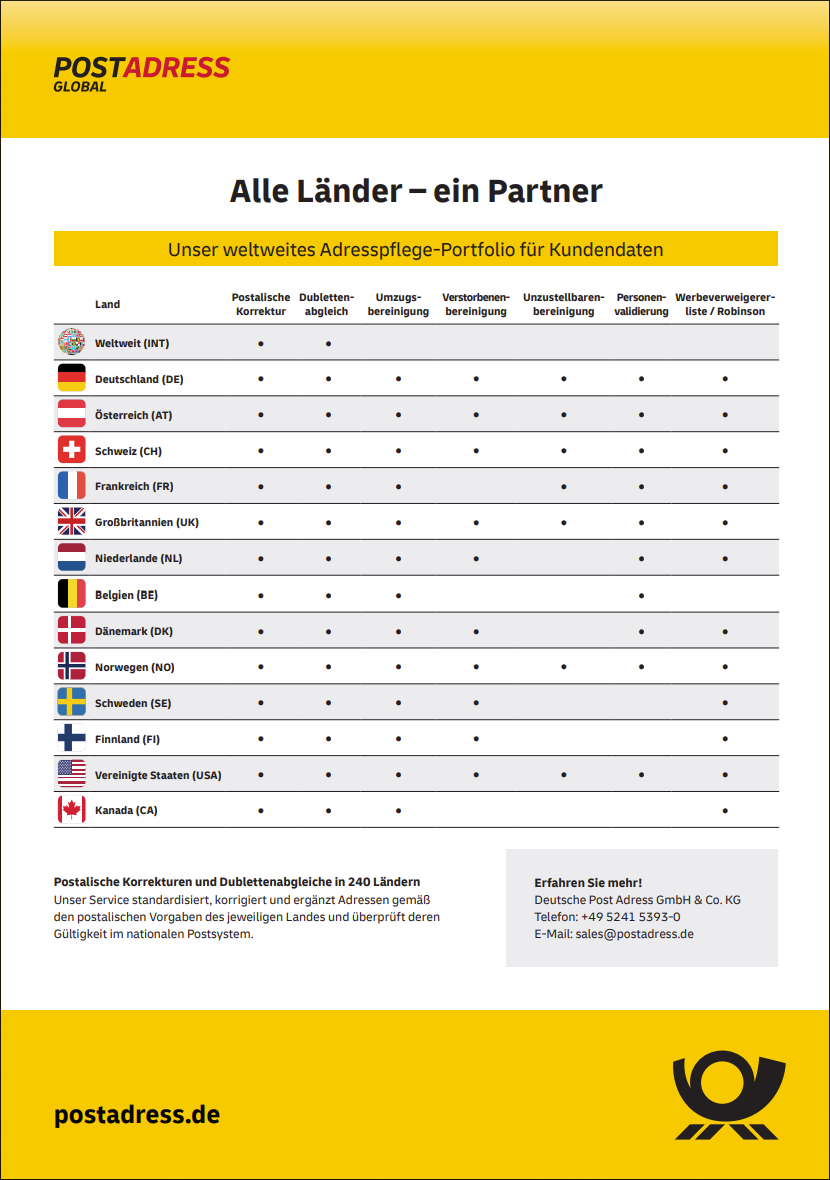 Egal woher Ihre Kunden kommen, wir übernehmen die Pflege Ihrer Adressdaten: sicher, schnell und effizient. Für nahezu alle Länder der Welt brauchen Sie so nur eine Quelle für Ihre Adresspflege: die Deutsche Post Adress.