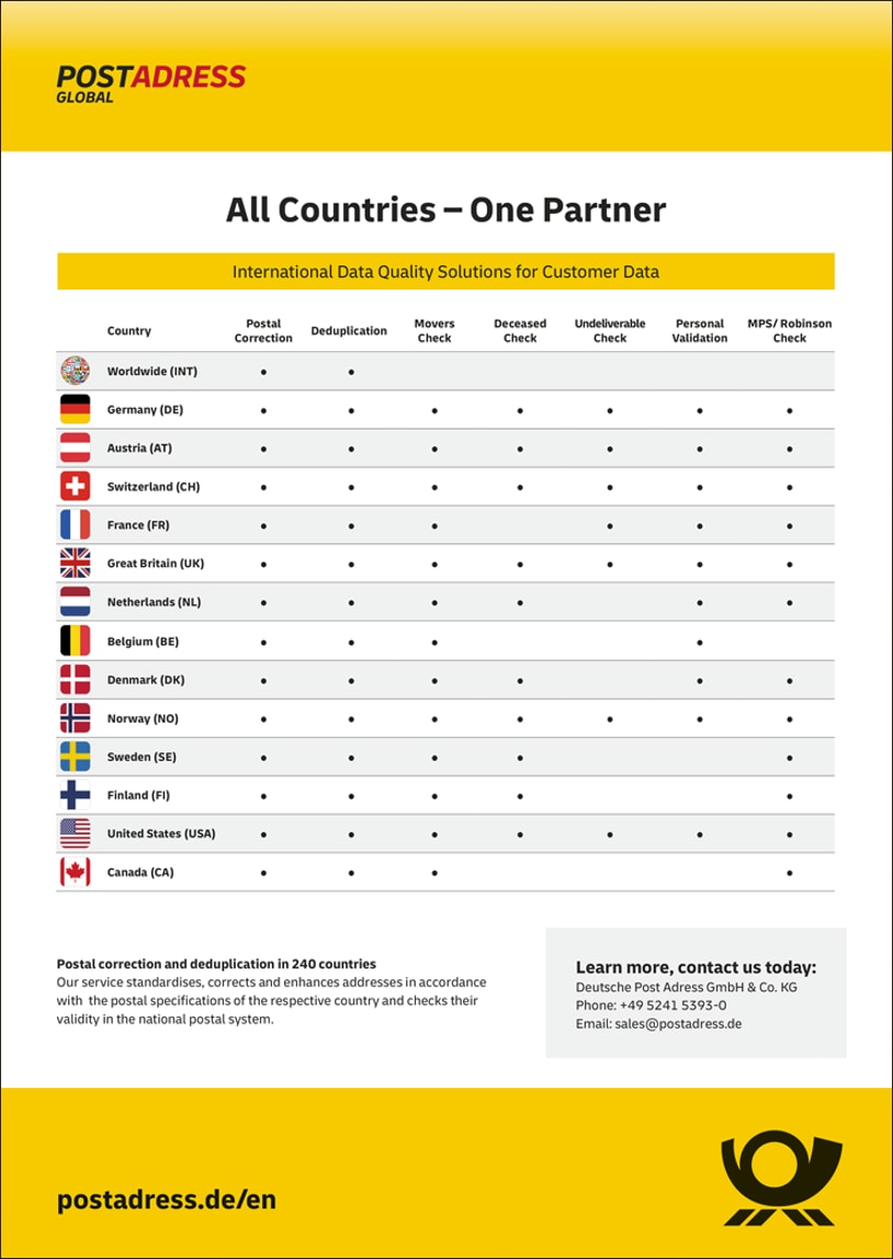 No matter where your customers are from, we take care of cleansing your data: securely, quickly and efficiently. For (almost) all countries in the world you only need one partner for your customer data management: Deutsche Post Adress.